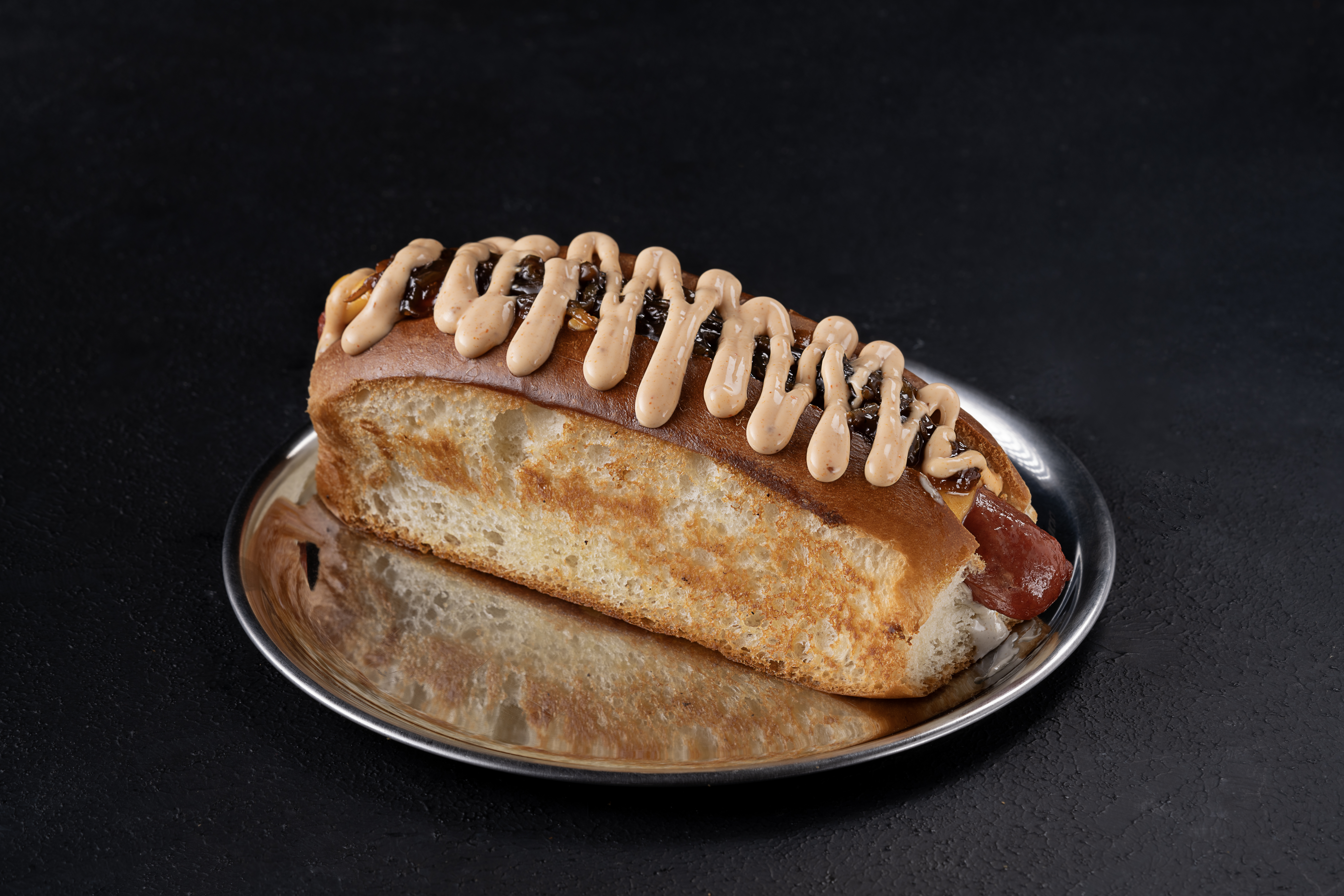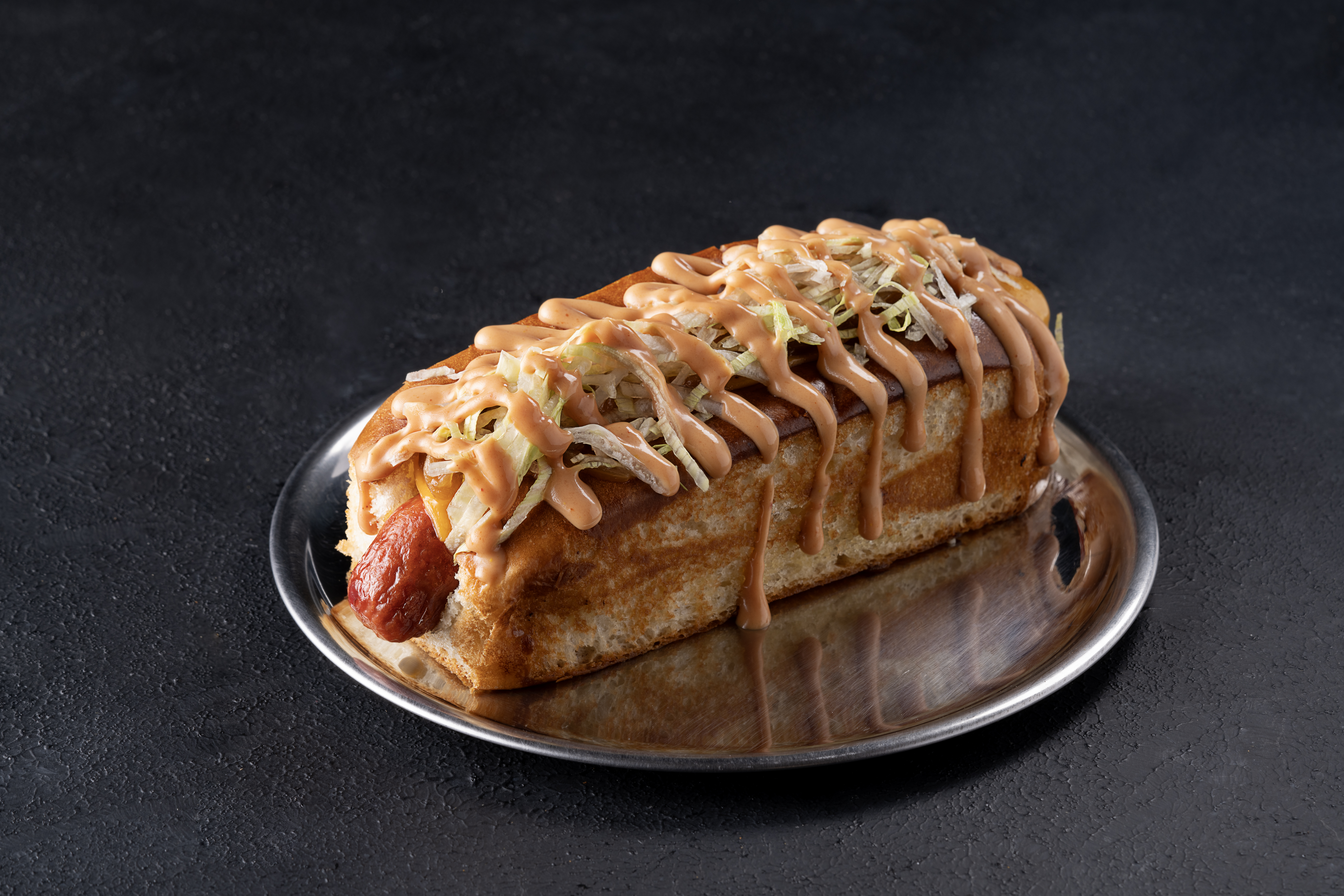 Frankfurter sosis, acı biberli soğan reçeli, trüf mayonez, burger peyniri, acı sos