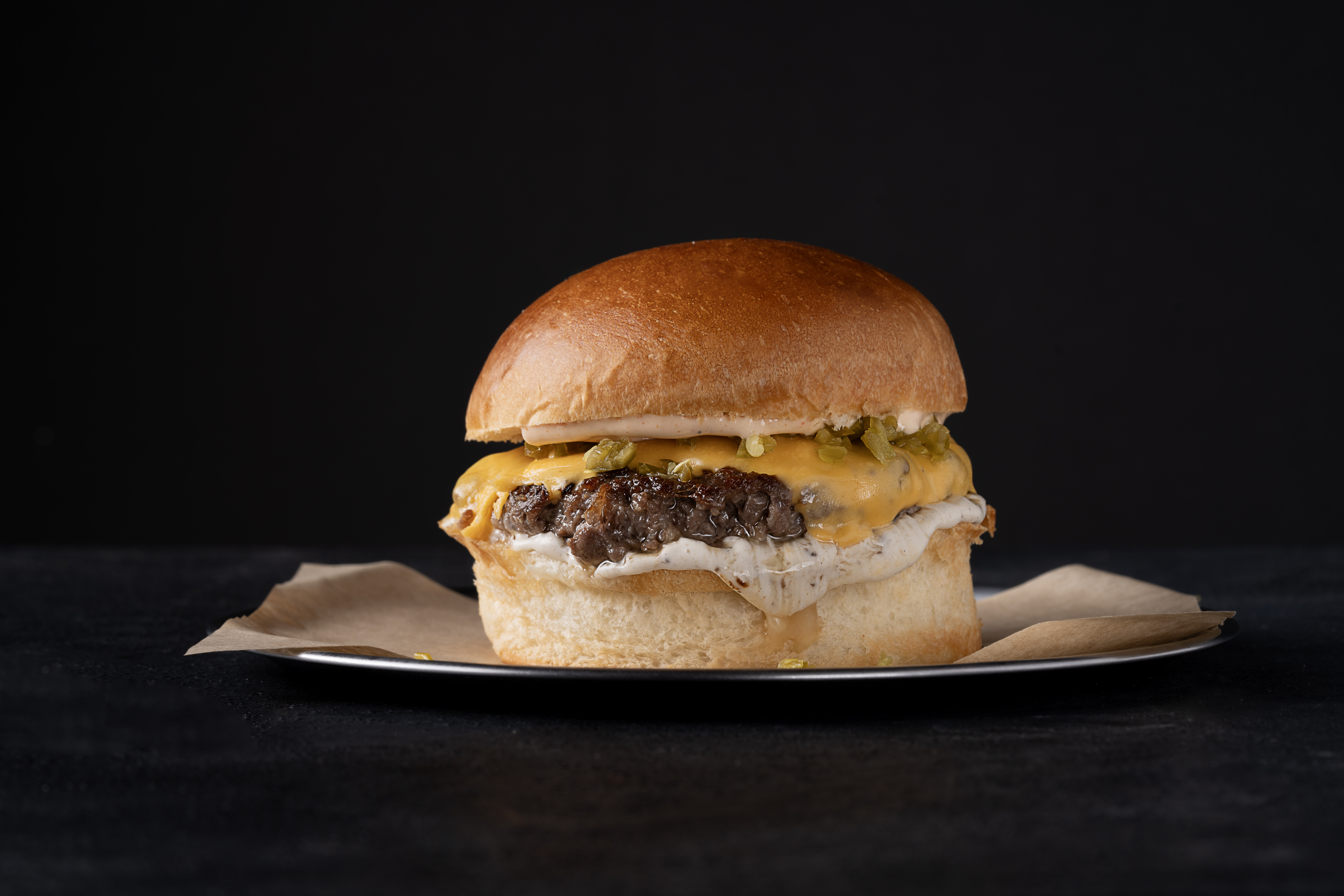 120gr. burger köftesi, acı sos, jalapeno biberi ezmesi, trüf mayonez, karamelize soğan, burger peyniri