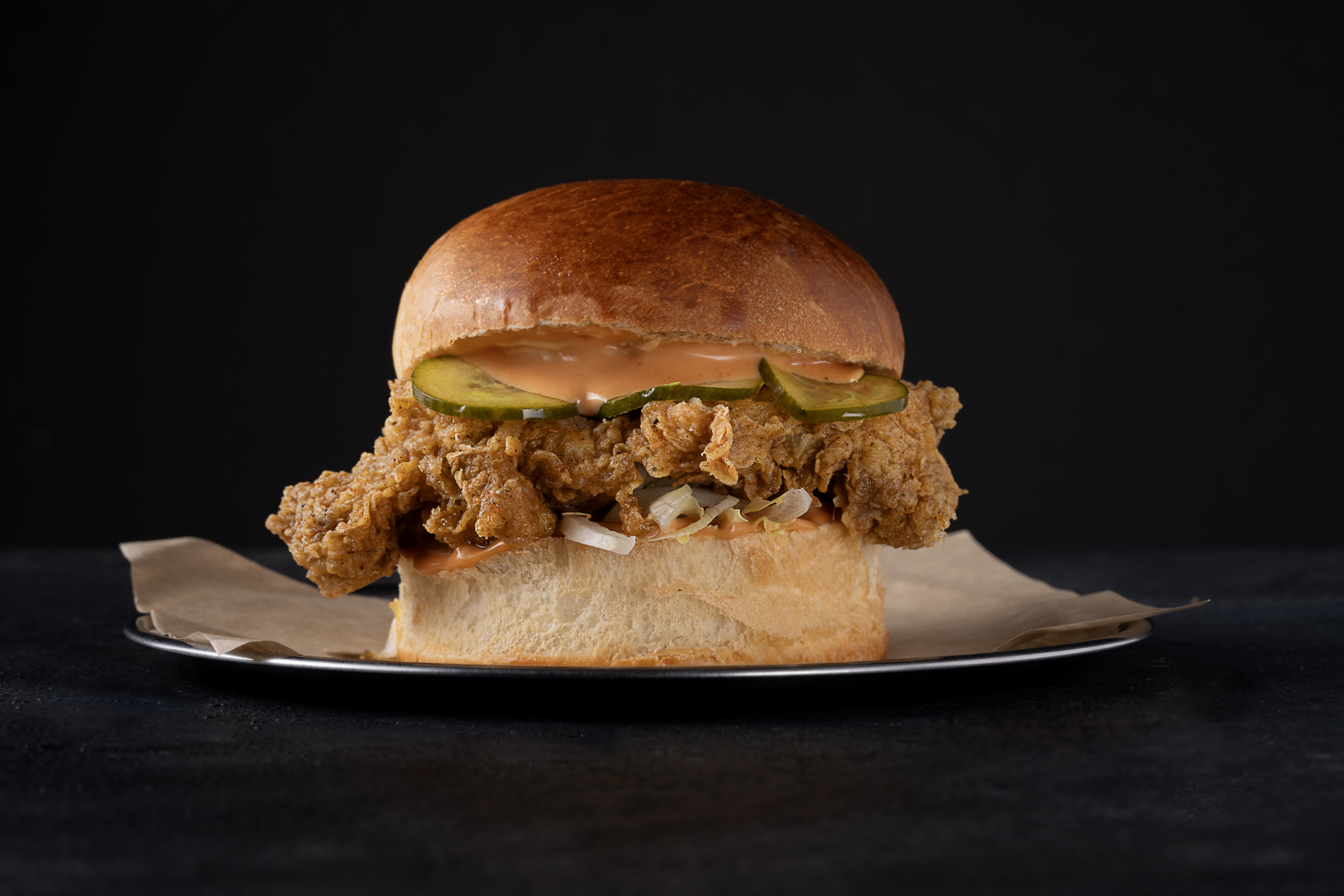 Kızarmış tavuk, marul, ev yapımı turşu, burger sos