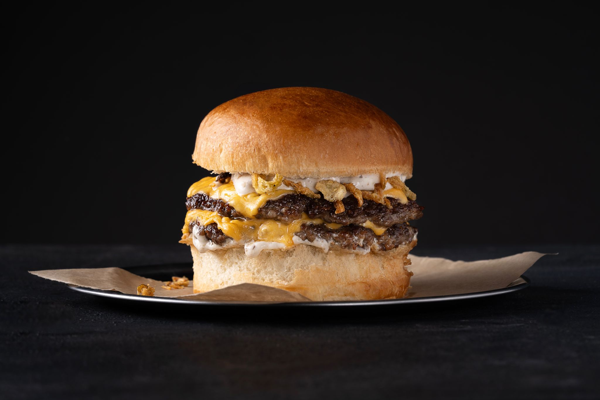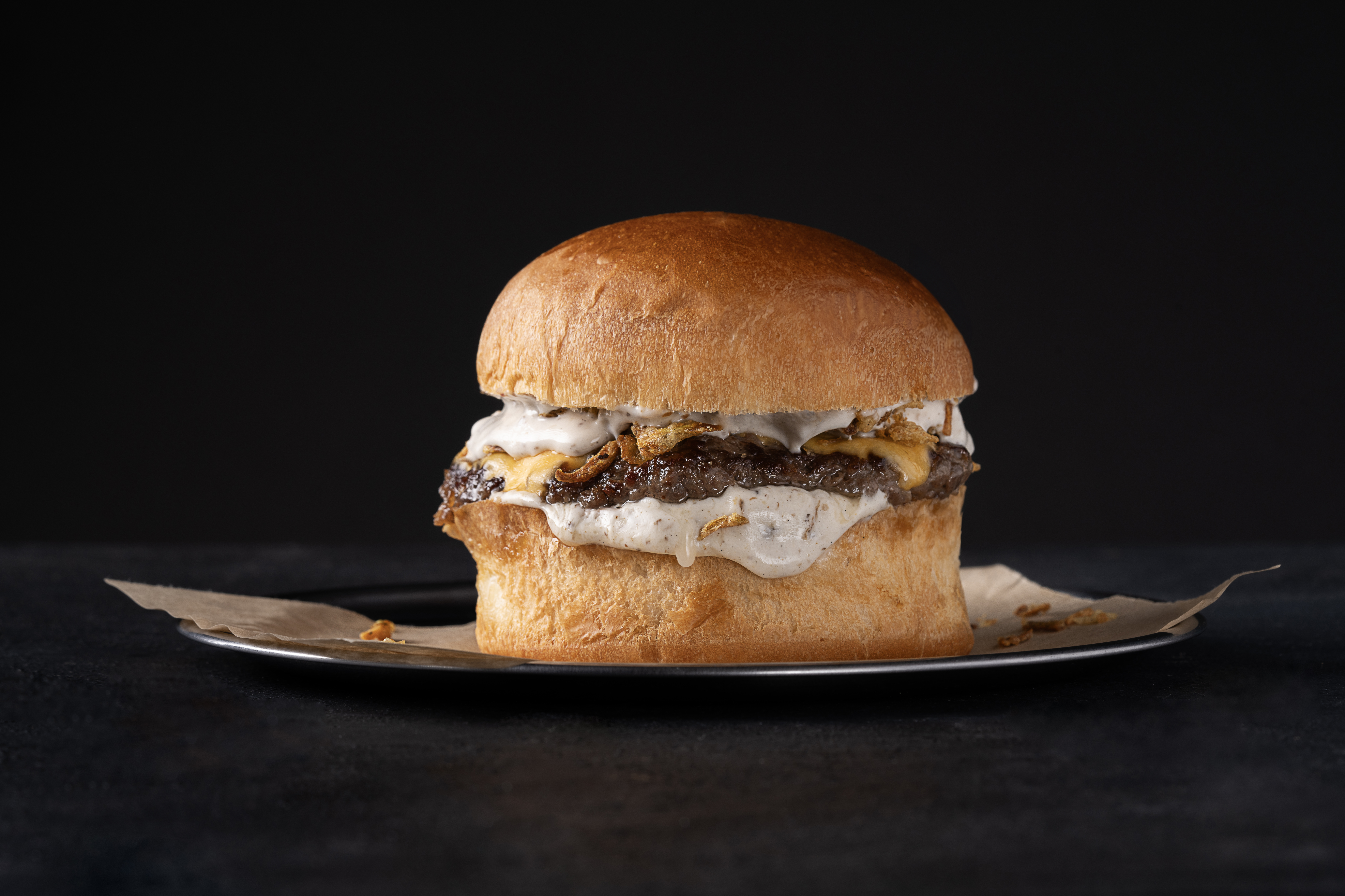 120gr. burger köftesi,trüf mayonez, kıtır soğan ve karamelize soğan, burger peyniri